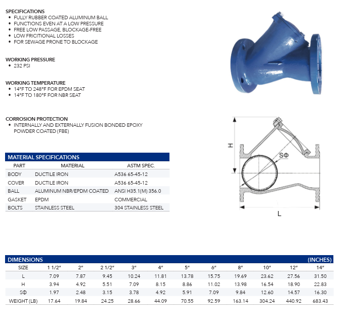 The Soval 1080 Series Ductile Iron Flanged Ball Check Valves are manufactured to ASTM A536 65-45-12 Standard designed for use in water and wastewater applications. Our ball check valve works when the ball inside the valve moves freely out of the path of flow, when the flow is drawn back in, the ball will automatically roll back to the closed position that will provide a positive seal to stop back flow.