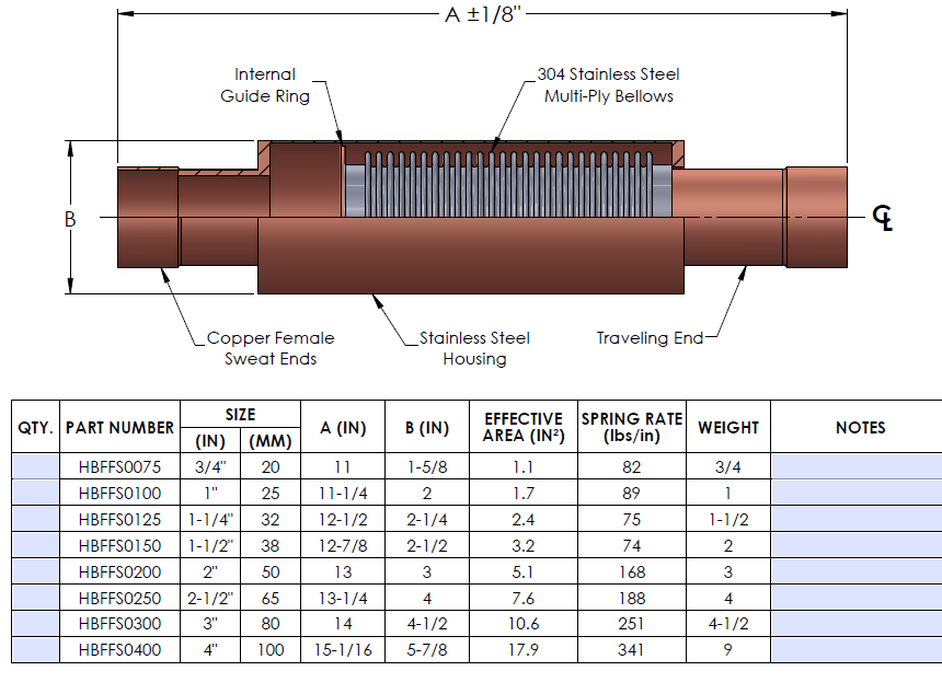 All-metal construction includes a stainless steel bellows and high quality carbon steel housings and fittings. Welded construction throughout with traveling nipple tack-welded with clip to insure proper installation. Model HB Series is available with SS housing and copper sweat ends for installation in copper lines.