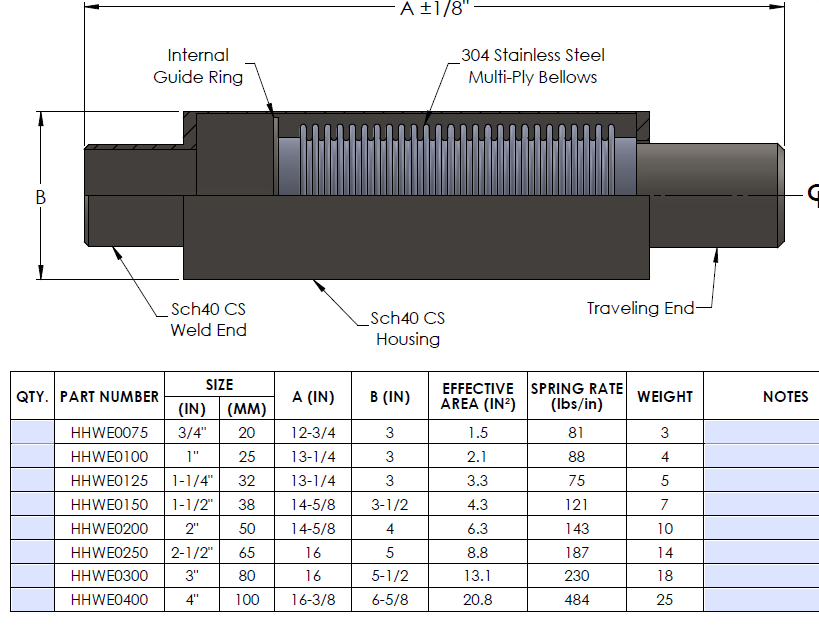 All-metal construction includes a stainless steel bellows and high quality carbon steel housings and fittings. Welded construction throughout…with traveling nipple tack-welded with clip to insure proper installation. Standard with male thread ends and is also available with weld or flanged ends.